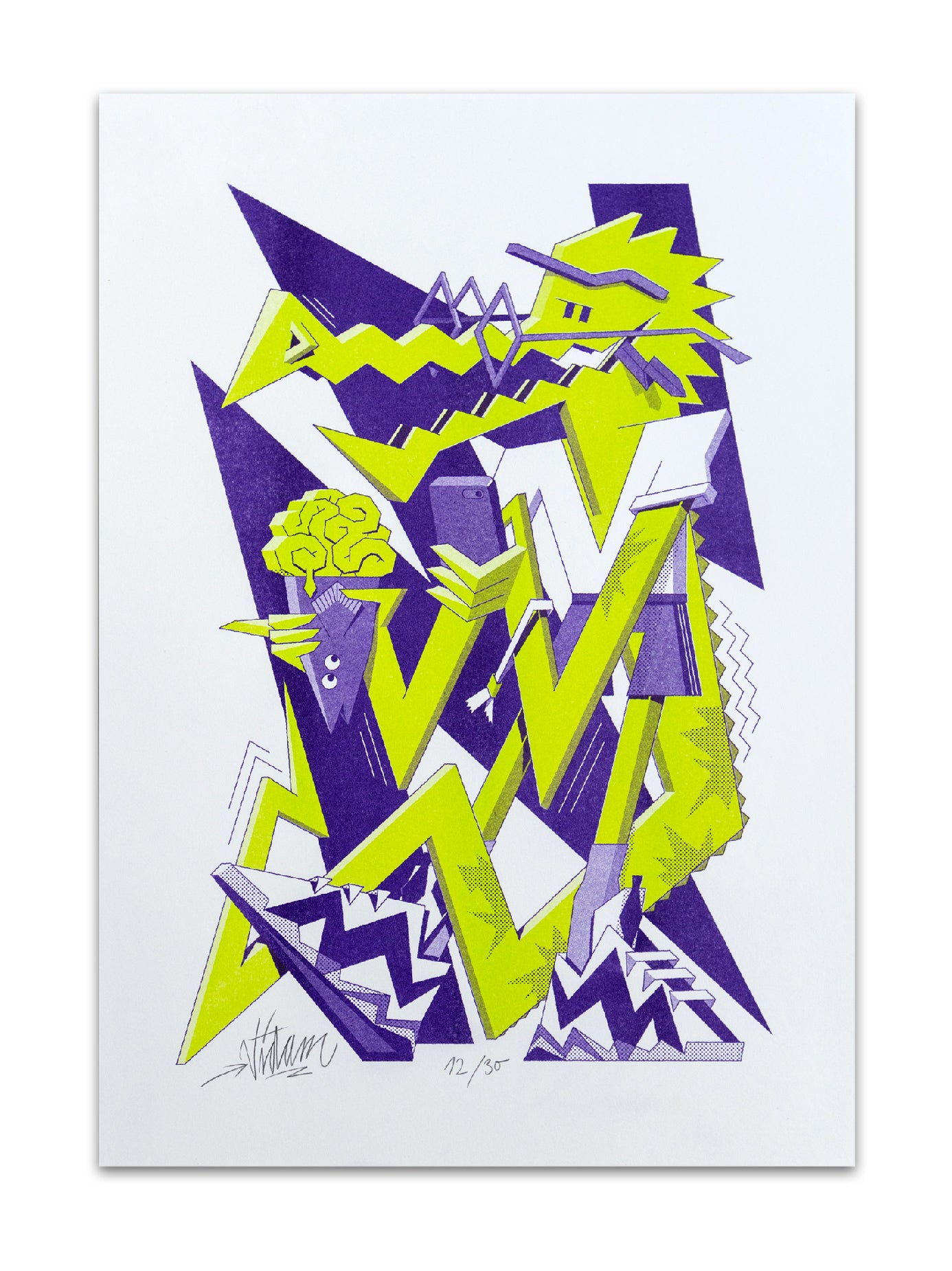 This is a 2-color Risoprint on very heavy Metapaper Extrarough Warmwhite 270g